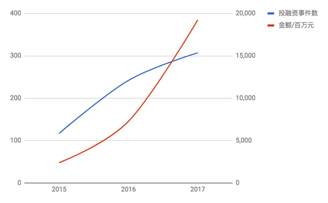 从 2015 年到 2017 年,共有超过 450 家涉及「人工智能」的创业公司拿到了超过 660 笔融资,总金额约 300 亿人民币。投资事件数和投资金额都逐年增加,事件数的增速在 2017 年有所减缓,投资额度却有飞跃式的提升:2017 年的投资金额,是 2015 年与 2016 年加起来的二倍还多。