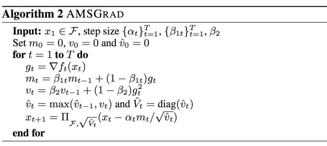 与 Adam 相比,AMSGrad 使用较小的学习率,但只要Γ_t 为半正定,那么它就保留了缓慢减弱历史梯度对学习率的影响这一直观属性。算法 2 展示了 AMSGrad 的伪代码,它与 Adam 的关键不同点就是它会保留所有 v_t 的最大值到当前时间步,并使用该最大值归一化梯度的移动均值,而不是使用 Adam 中的 v_t。通过这样的修正,AMSGrad 可以保持非递增的下降步大小,并避免了 Adam 和 RMSProp 的缺陷,即对于常数 β_2 和所有 t ∈ [T] 都有 Γ_t⪰0。此外在算法 2 中,实践上会典型地使用常数 β_1t,而实际证明要求一个递减的方案来保证收敛性。