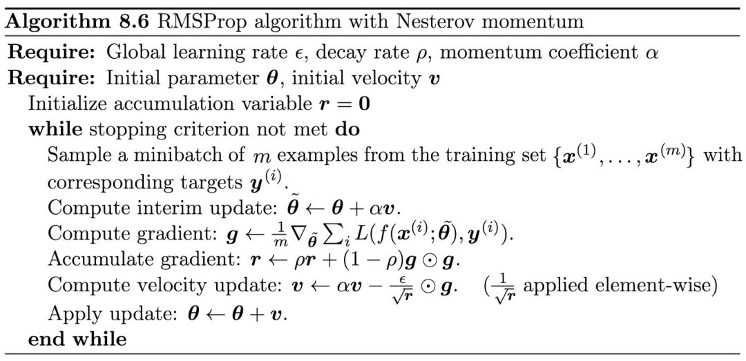 我们同样可以结合 Nesterov 动量而提升经典 RMSProp 算法的效果: