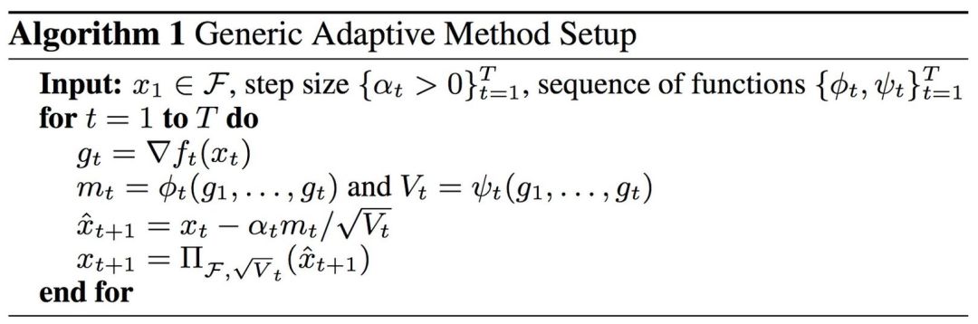 原作者为适应性方法提供了一个通用性框架,它展示了不同适应性方法之间的区别,并有利于我们理解 Adam 等方法的缺陷。以下算法 1 给出了一般适应性框架的伪代码,该算法仍然非常抽象,因为「均值」函数φ_t 和 ψ_t 并没有明确指定。其中φ_t 为 d 维向量,而ψ_t 为 d*d 维正定矩阵。为了便于展示,作者将 α_t 设为下降步大小,将 α_t * V_t^(-1/2) 设为算法的学习率。此外,作者将算法 1 封装的适应性方法限制为对角方差矩阵,即 V_t = diag(v_t)。我们发现因为φ_t(g_1, . . . , g_t) = g_t 、 ψ_t(g_1, . . . , g_t) = I,标准的随即梯度下降会失效,其中对于所有的 t ∈ [T],α_t = α/sqrt(t)。