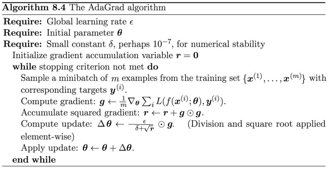 如下伪代码所示,AdaGrad 首先抽取 m 个训练样本和对应的样本标注,然后基于这些样本计算损失函数对特定参数的梯度。将该梯度的平方加入历史梯度项 r,然后再以 1/sqrt(r) 缩放学习率,从而根据历史梯度的大小为每个参数定制学习率,其中 δ 是为防止分母为零的常量。