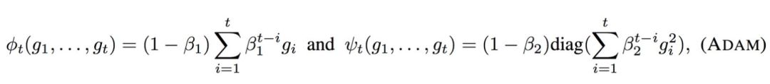 基于指数移动均值的 AdaGrad 变体在深度学习社区中非常流行,RMSProp、Adam、NAdam 和 AdaDelta 都是这种变体的先驱研究。它们和 AdaGrad 最大的区别就是使用指数移动均值作为函数ψ_t,而不是使用简单的均值函数。Adam 是最流行的一种变体,它使用的均值函数如下: