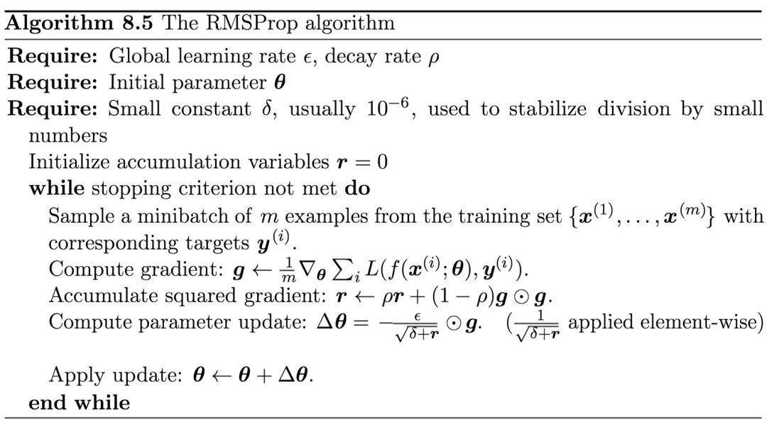 如上为 RMSProp 的标准算法,首先我们需要初始化全局学习率和控制移动平均长度范围的超参数 ρ。在算法的循环体中,首先需要采样一个批量的数据,并计算损失函数对所有参数的梯度而作为梯度向量。随后根据超参数 ρ 决定需要遗忘的历史梯度范围,即计算指数移动均值,并储存在变量 r 中。最后只需要利用历史梯度信息缩放对应的学习率就能完成梯度下降,在这些计算过程中,⊙表示对应元素之间的乘积。