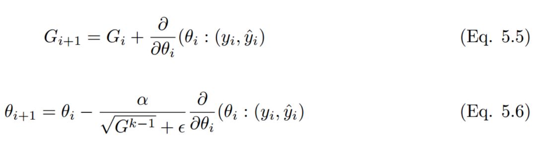 AdaGrad 亦称为适应性梯度(Adaptive Gradient),它允许学习率基于参数进行调整,而不需要在学习过程中人为调整学习率。AdaGrad 对具有较大梯度的参数相应地有一个快速下降的过程,而具有小梯度的参数在学习率上有相对较小的下降速度。因此,AdaGrad 成了稀疏数据如图像识别和 NLP 的天然选择。然而 AdaGrad 的最大问题在于,某些案例中的学习率会变得太小,学习率的单调下降也会使得网络停止学习过程。在经典的动量算法和 Nesterov 中,加速梯度参数更新是对所有参数进行的,并且学习过程中的学习率保持不变。在 Adagrad 中,每次迭代中每个参数使用的都是不同的学习率。以下是 AdaGrad 的参数更新式: