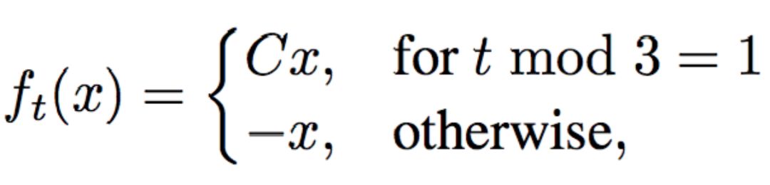 其中 C>2。对于这个函数序列,我们很容易了解到 x=-1 提供了最小的回退。以下结果表明,当 β_1 = 0 和 β_2 = 1/(1 + C 2 ) 时,Adam 收敛于 x = +1 的高度次优解。直观上的推理如下,该算法每三步会获取一个较大的梯度 C,其它两步则会观察到梯度-1 而导致错误的方向。较大的梯度 C 不能抵消这种影响,因为对于给定的 β_2 值,x 几乎只会以常量 C 来缩小,因此算法只能收敛到 1 而不是-1。