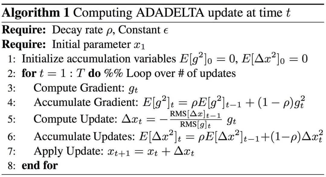 如上是 AdaDelta 的更新方式及简单的推导。如以下伪代码,其描述了 AdaDelta 的详细计算与更新过程:
