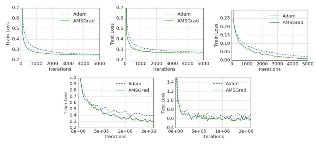 图 2:ADAM 和 AMSGRAD 算法在 Logistic 回归、前馈神经网络和 CIFARNET 上的性能对比。第一行的左图与中图表示 ADAM 和 AMSGRAD 算法在 Logistic 回归的性能,第一行右图表示它们在一层前馈神经网络和 MNIST 数据集的训练损失。第二行表示两种优化方法在 CIFARNET 的训练损失与测试损失。