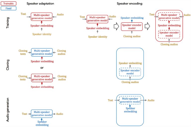 在这项研究中,我们聚焦于两种基本的方法,以解决语音复制的问题:说话者适应(speaker adaptation)和说话者编码(speaker encoding),这两种技术都可以通过说话者嵌入向量应用于一个多说话者生成语音模型,而不会降低语音质量。关于语音的自然性以及它和原始说话者的相似性,这两种方法都可以获得很好的性能,即使只有少量的复制音频。