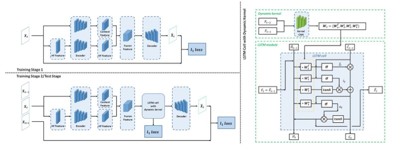 论文提出的视频预测模型图示。该架构使用论文提出的多频带分析和时变卷积核技术,能够更大限度的利用输入信息和更灵活的应对视频内容的动态变化,使得更精确地预测像素级的视频内容成为可能。