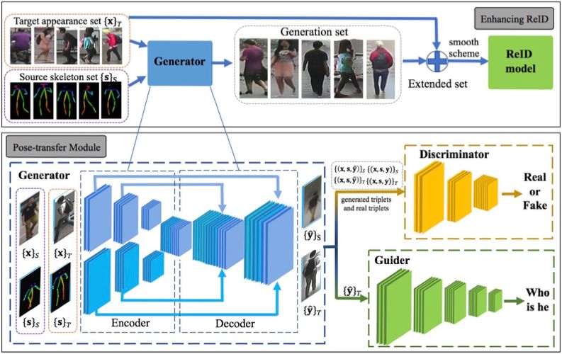 假设给定大小两个数据集,分别称为 A 和 B。其中数据集 A 中覆盖的行人姿态少,而 B 中的样本包含丰富的姿态。作者提出将数据集 A 中的图片样本与数据集 B 中样本的骨架进行配对,并通过 Skeleton-to-Image 模型生成与 A 中样本共享身份信息且与 B 中样本共享姿态的新样本集 C。为了提高生成样本的质量,作者提出了一个与对抗生成网络中的判别器平行的向导模块。向导模块是一个预训练好的行人再识别模型,用于指导生成器生成包含更丰富身份信息、更适应行人再识别任务的样本。在得到了生成样本集 C 后,作者将其与数据集 A 混合并通过平滑机制分配样本权重后训练模型。实验结果表明此方法能够与其他高性能方法 (包括特征学习、度量学习类方法) 结合并进一步提升它们的性能。