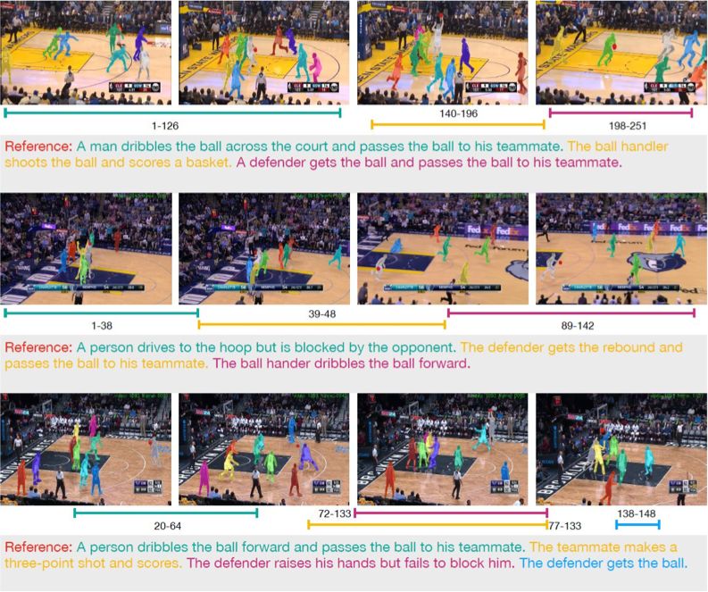 体育视频自动解说效果展示。所有球员的角色、关系和位置,及球的位置都实现了准确的理解识别。相比较传统的「一群人在打篮球」的粗略描述,这篇文章实现的描述更加细致、准确,可以全面真实地反映运动场上的实际情况。