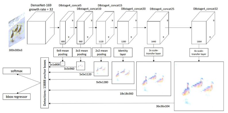 基于尺度转移模块的物体检测。尺度转移模块由简单的 mean pooling 层和尺度转移层构成,被嵌入到 DenseNet 网络的最后一个模块中,从而得到不同分辨率的被用来做物体检测的特征图。尺度转移层可以有效地减少输入特征图的通道数,同时扩大其分辨率,不增加额外的计算开销。