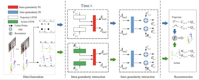 多粒度群体交互预测框架。首先我们把骨架序列处理成两个不同粒度的信息,分别代表整体轨迹运动和肢体细节运动。基于 seq2seq 预测结构,我们设计了同粒度间信息交互子网络来考虑群体之间的相互影响,以及不同粒度间的信息交互子网络来促进两个粒度上信息的交互,更准确地预测结果。最后整合预测出的两个粒度信息,展示群体交互预测结果。