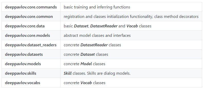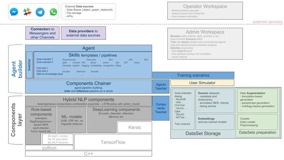 DeepPavlov 建立在机器学习库(TensorFlow、Keras)之上。可以用其它外部的库建立基础组件。