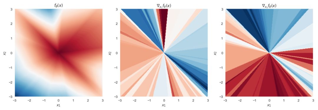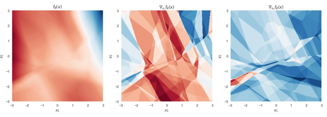 左图显示函数本身。它旁边的图分别显示了该损失函数对 x_1 和 x_2 的梯度。该函数是分段线性的(这很难观察,因为有很多的线性块),这意味着梯度是分段恒定的(这在视觉上更明显)。