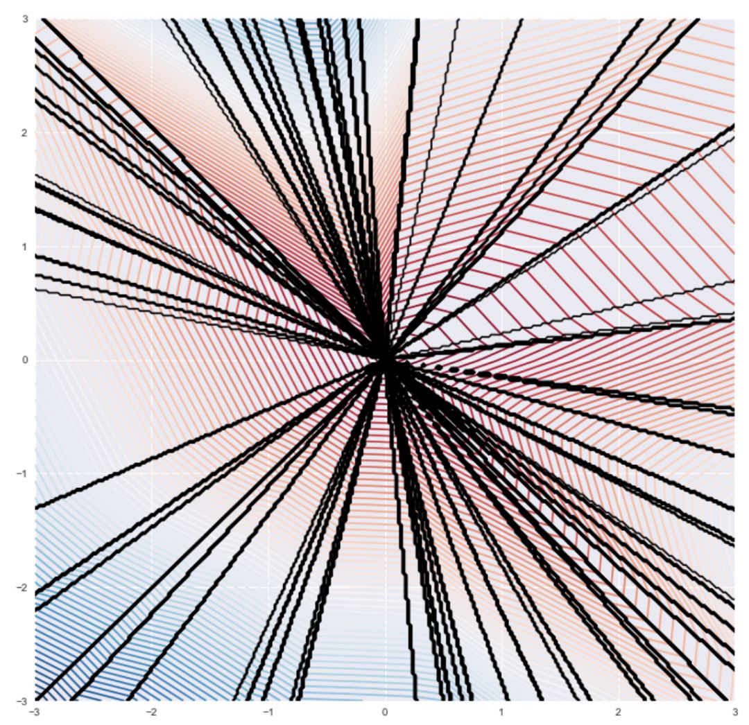 从这些图中不太清楚,为什么像这样的函数能够模拟数据,以及为什么如果我们添加偏置项会得到更一般的分段线性函数。在高维上理解是有帮助的,因为高维度中两个随机采样的数据点落入同样的「pyramind」(即共享相同的线性区域)的概率是非常小的。除非你的数据有一定结构,使得对于很多数据点同时可能发生这种情况,否则我想你不需要担心。