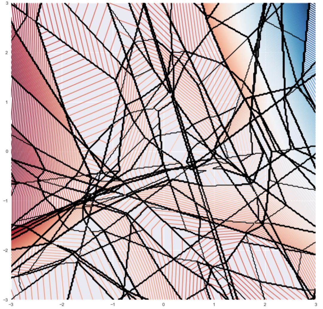 f 的分段线性结构变得更加明显,我们在 f 本身的等高面(红—蓝)上叠加了梯度的等值线图(黑色)。