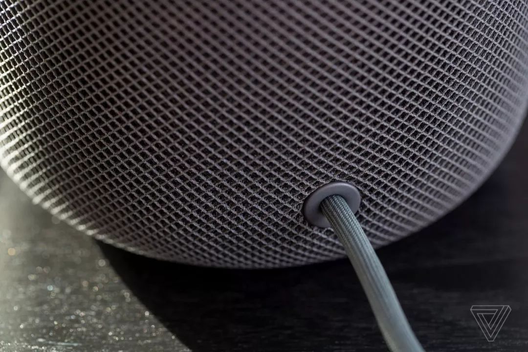 HomePod 的电源线内置在产品中,采用织物包裹。在 HomePod 上面有 LED 背光音量按钮,还有一个「显示屏」,不过并不是真的。磨砂玻璃板下面是 LED,可以将灯光分散成单一的色彩,但它并不像一个显示界面那样可以精确地展示一些东西。苹果表示,它的设计就是一个触摸面,不是为了展示文字。HomePod 的底部是一个硬质的橡胶材料,用户需要将 HomePod 放在一个坚硬的平面:如果把音箱放在不平或者软的地方,大多音箱都会罢工,或者音质听起来很差。