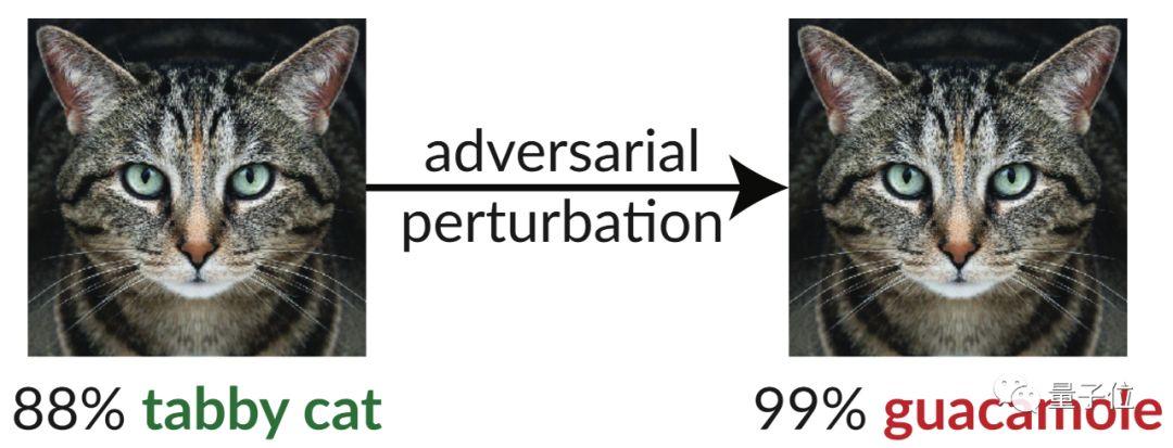 举个例子。在上面这张图片中,一张花斑猫的图像经过轻微扰乱后,就被骗过AI,被InceptionV3分类器错误的识别成了牛油果沙拉酱。