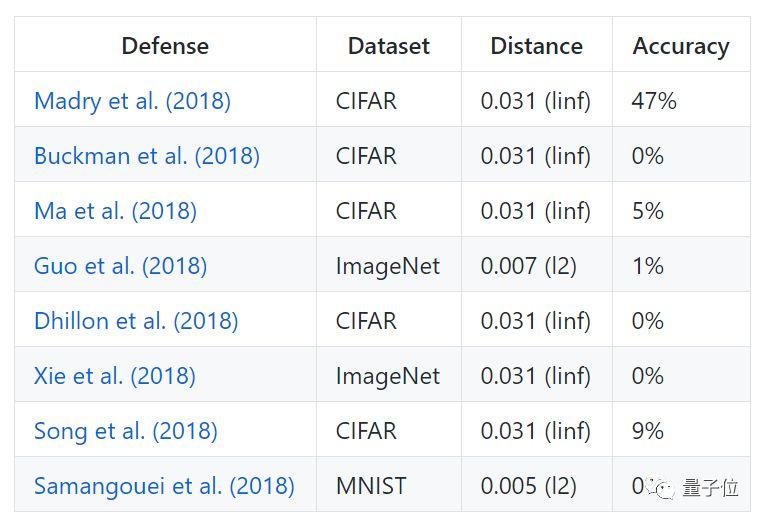在论文中,他们说从ICLR 2018接收的对抗样例防御论文中排除了3篇,其中两篇有已经证实的防御方法,一篇只针对一种黑盒情况。但是在论文摘要和GitHub repo里没有说清楚。Goodfellow建议严谨地写成"所有未经证实的白盒场景下的防御"。