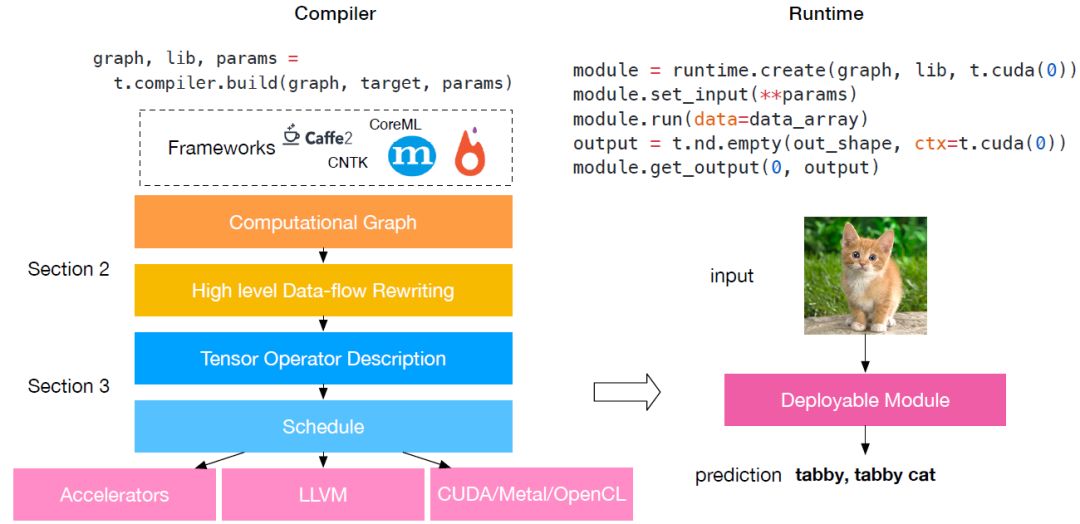 我们构建了一个端到端的编译优化堆栈,允许将高级框架(如 Caffe、MXNet、PyTorch、Caffe2、CNTK)专用的深度学习工作负载部署到多种硬件后端上(包括 CPU、GPU 和基于 FPGA 的加速器)。