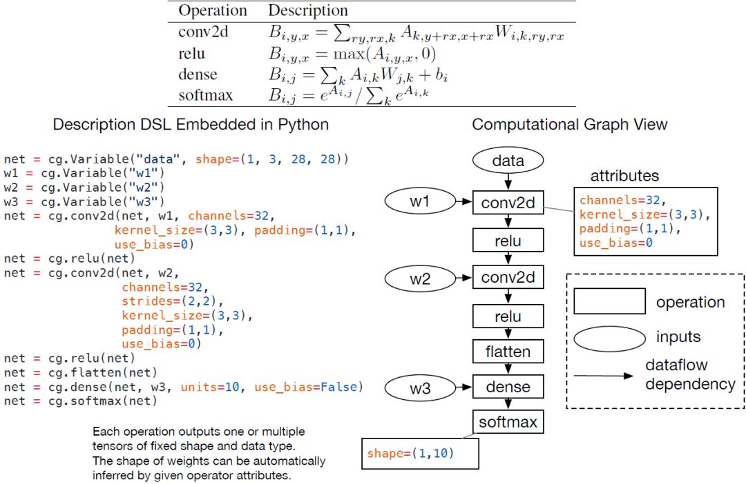 目前的深度学习框架依赖于计算图的中间表示来实现优化,如自动微分和动态内存管理 [3,7,4]。然而,图级别的优化通常过于高级,无法有效处理硬件后端算子级别的转换。另一方面,目前深度学习框架的算子级别库通常过于僵化,难以轻松移植到不同硬件设备上。为了解决这些问题,我们需要一个可实现从计算图到算子级别的优化,为各种硬件后端带来强大性能的编译器框架。