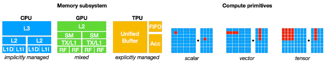 图 1:CPU、GPU 与类 TPU 加速器需要不同的片上存储架构和计算基元。在生成优化代码时我们必须考虑这一问题。