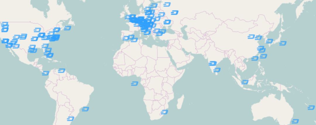 Dashcoin 主节点的全球分布图。