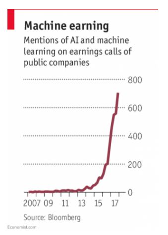 随着人工智能的影响逐渐超出科技范围,它将助力公司向老牌公司发起挑战。而这种情况在汽车领域正在上演,比如一些自动驾驶初创公司和顺风车公司,Uber 就是其中一个例子。 但它也将改变其它公司运作的模式,传统的功能将因此发生改变,如供应链管理、客户服务和人员招聘。 不过,人工智能的发展前景无限但也同样是危险重重。 根据 MIT 的《斯隆管理评论》和波斯顿咨询公司的数据,85% 的公司认为人工智能将提供一个竞争优势,但今天 20 家企业中只有一家企业「大规模」部署了人工智能。 大型公司和产业如金融产业,能够产生大量的数据,它们会走在前列,会搭建自己的人工智能优化系统。但许多公司会选择与独立的人工智能供应商合作,如云提供商,咨询公司和初创公司。 人工智能的竞争不仅存在于企业之间,也存在于国家之间,尤其是在中美之间。 中国企业拥有一个早期的优势,比如因为政府拥有大量面部数据,可以帮助训练人脸识别算法。中国人对隐私的关注度相对于西方会稍低一些。 但前方所面临的困难也很多。其中一个问题就是时间的问题。 风投基金 Bloomberg Beta 的 Roy Bahat,将当前和 90 年代末互联网大爆发进行了一个对比:「公司很难决定应将资金投到那些地方。」 如果他们在人工智能的早期投入太多资金,他们会面临过度投资的风险或者将大量资金投到毫无价值的公司,就如许多人在互联网早期做的那样。 但如果他们等的太久,他们有可能会面临来自新兴公司或者比他们更快利用科技的竞争对手的挑战。 媒体的大肆报道可能对一些人产生了误导,认为人工智能就是一个魔法棒,就如同安装一个微软软件一样简单,印度咨询公司 Tata Consultancy Services 的员工 Gautam Schroff 这样说道。 人工智能需要大量的数据储备,高度的算法检测以及许多有益的定制化。微软的 Gurdeep Singh 将人工智能系统比作「愚笨的专家」;他们可以轻松的完成一些人类觉得很烧脑的工作,比如检测商品上细微的瑕疵或者迅速讲数百万张面部照片进行分类,但有些事情,人们可以很轻松的完成,而人工智能却无法做到,比如基本的逻辑推理。 1956 年,当学术研究人员首次聚集在一起谈论人工智能的时候,他们就在寻找一种方式将人类的「一般」智力融入到机器之中,包括复杂的推理。但这一想法仍在是一个难以实现的愿望。 对人工智能的追捧使得人们难以区分哪些是夸张,哪些是现实。 全球的上市公司中,2017 年第四季度财报上提到人工智能和机器学习的次数超过了 700 次,是 2015 年同期的 7 倍。但硅谷资深人士 Tom Siebel 表示,人工智能的一些价值并没有体现,很多公司却在大肆宣扬,一些人应该开一个「人工智能假新闻」的平台。 上市公司们在财报中提及人工智能的次数在2007年~2017年期间发生的变化