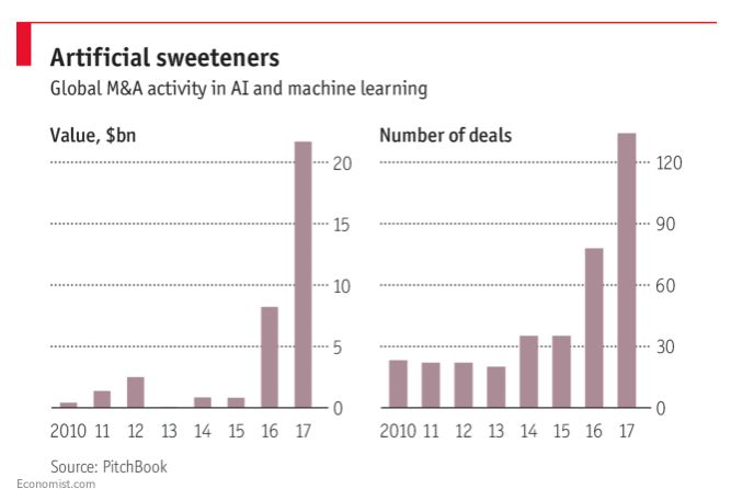 | 测谎仪在商业上并未得到广泛应用,但平安保险却认为它可以识别谎言。 公司要求,申请贷款的客户需通过 app 申请。借款人需要通过视频回答有关收入和还款计划的问题。 该 app 可以对近 50 个面部微表情进行监测,从而识别他们是否在讲真话。这个有人工智能赋能的项目可以帮助对一些客户进行进一步的审查。 人工智能改变的不仅仅只是借款人的银行账户余额。消费品公司强生和咨询公司埃森哲使用人工智能对职位申请人进行筛选,选出最佳人员。 人工智能也在帮助凯撒宫赌场度假酒店对消费者可能的消费需求进行分析,从而提供个性化的促销手段吸引消费者。媒体和金融信息公司彭博社采用人工智能对其它公司的财报进行扫描,并自动生成新闻稿。 移动电话营办商沃达丰(Vodafone)可以在用户设备出现问题之前,预测网络的问题。各行各业的公司都在使用人工智能监测网络安全威胁和其它的风险,比如员工的不满情绪。 相较于依靠直觉和初略的估计,人工智能赋能的预测因更加智能,速度更快使得业务效率大大提高。 在法国家装建材零售集团乐华梅兰集团 (Leroy Merlin),经理人员过去是在周五预定新的存货,在一周之前对同样的商品进行预设,以便他们能更快开始自己的周末。 现在公司使用算法对过去的销售数据和其它会影响销售的信息如天气预报进行分析,使得存货周转更加的高效。负责这一项目的人工智能初创公司 Manuel Davy of Vekia 表示,这一举措帮助公司甚至在销售增长 2% 的情况下,还将存货减少了 8%。 人工智能和机器学习(这两个术语经常交叉使用)使得计算机可以处理大量的数据,并找出其的模式,在无需特殊编程的情况下就能够进行预测。 数量巨大的数据、更加复杂的算法以及超强的计算能力赋予了人工智能更大的能力。所呈现的结果相当于一对分析师在拥有无限时间和资源的情况下所达到的效果,不仅如此,人工智能的工作效率还更快,更高效,成本也更加的低廉。 人工智能主要的一个作用即使预测成本的急剧下降,新书 Prediction Machines 的合著者,多伦多大学的 Ajay Agrawal 表示。 如同电使得照明更廉价一样——今天的照明成本比 1800 年减少了 400 倍,人工智能使得预测也更加的便宜、可靠,应用也更加的广泛。 计算机在数十年前就已经能够阅读文章和数字了,但直到最近它才能够进行看、听和说。斯坦福人工智能实验室主任,同时也是谷歌云计算首先科学家李飞飞表示,人工智能如同一个「色拉盘」,融合了各个不同的领域和学科。 人工智能的次级领域包括改变工厂和生产线的机器人技术,以及应用于自动驾驶技术的计算机视觉技术。 李飞飞说,计算机视觉是人工智能「最具有杀伤力的应用」,因为它可以应用于许多的场景,但人工智能在语音识别方面表现的也越来越出色。 手机以及智能音箱上的语音助手就是依赖于语音识别,算法可以理解语音请求,并对说话者的语音语调和说话内容进行识别。 商业版图的变革 目前来看,人工智能的主要受益方还主要在科技领域。今天大多的科技巨头,如西方的谷歌、亚马逊,中国的阿里巴巴和百度,如果没有人工智能进行产品推荐,绝不会达到今天这个水平。 例如,亚马逊的人工智能应用相当的广泛,如指挥库房中的机器人、对打包和配送进行优化,识别假货以及赋能语音助手 Alexa。 作为亚马逊的竞争者,阿里巴巴也在物流中广泛使用了人工智能技术;其下属在线支付平台蚂蚁金融,真正探索利用面部识别对交易进行验证。谷歌 CEO 桑达尔·皮查伊曾说,人工智能将比电或者火产生「更加深远的」影响。 众多领域的非科技公司的老板都开始担忧人工智能会对它们产生巨大的威胁,然后他们开始收购一些有前景的科技公司,确保在人工智能的大潮中不被赶超。 根据数据提供商 PitchBook 的数据显示,2017 年,在全球,与人工智能相关的并购金额大约在 218 亿美元,是 2015 年的近 26 倍。 这样做的部分原因是想吸引人才,因为这个领域的人才很是稀缺。没有盈利的初创公司为每位人工智能专家提供高达 500-1000 万的薪酬。 2010~2017年与AI相关的并购案数量与金额变化