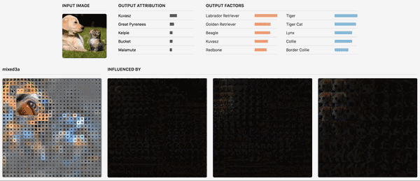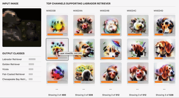在上面这个界面里,我们提供了更灵活的归因关系。通过上面这个图标,我们已经开始考虑更高层次概念的归因。例如在特定的位置,许多概念纠缠在一起,这个界面仍然很难把它们分开。于是就有了下面通道归因的尝试。