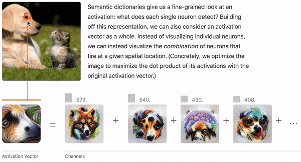 先用特征可视化来探索mixed4d层的通道,再通过计算输出的归因来过滤特定的类别,然后,通过仔细研究各个通道,我们可以得到一幅空间激活的热力图,再通过研究空间位置得到精确到神经元的归因。