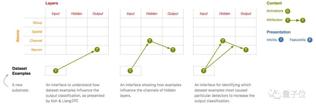 如上图所示,每种元素都通过特定的展现方式(PRESENTATION),展示了某一类内容(CONTENT),这个内容的基质可以描述成网络的层(LAYERS)如何划分为原子(ATOMS)。比如说,用特征可视化来展现隐藏层神经元的激活,就是一种向用户解释神经网络的界面。