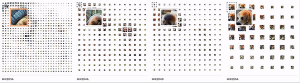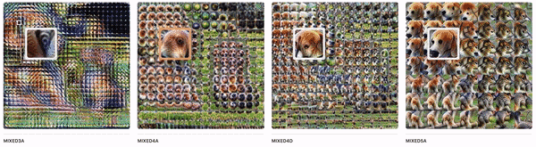 通过跨层(例如mixed3a、mixed4d)研究,我们可以查看网络理解如何进化发展:从早期图层的边缘检测,到后期更复杂的形状和对象识别等等。