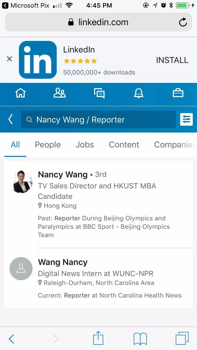 点击「添加至手机通讯录」后,系统会自动跳至手机通讯录页,在那里,你可以对信息进行修改。 点击「找寻 TA 的 LinkedIn 账号」后,系统会跳转至浏览器端的 LinkedIn 搜索结果页,在这里,你可以从诸多姓名相同的不同用户中选择正确的那位。