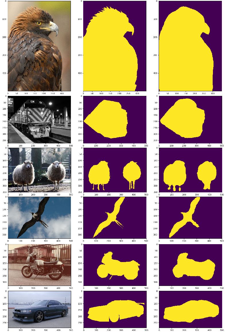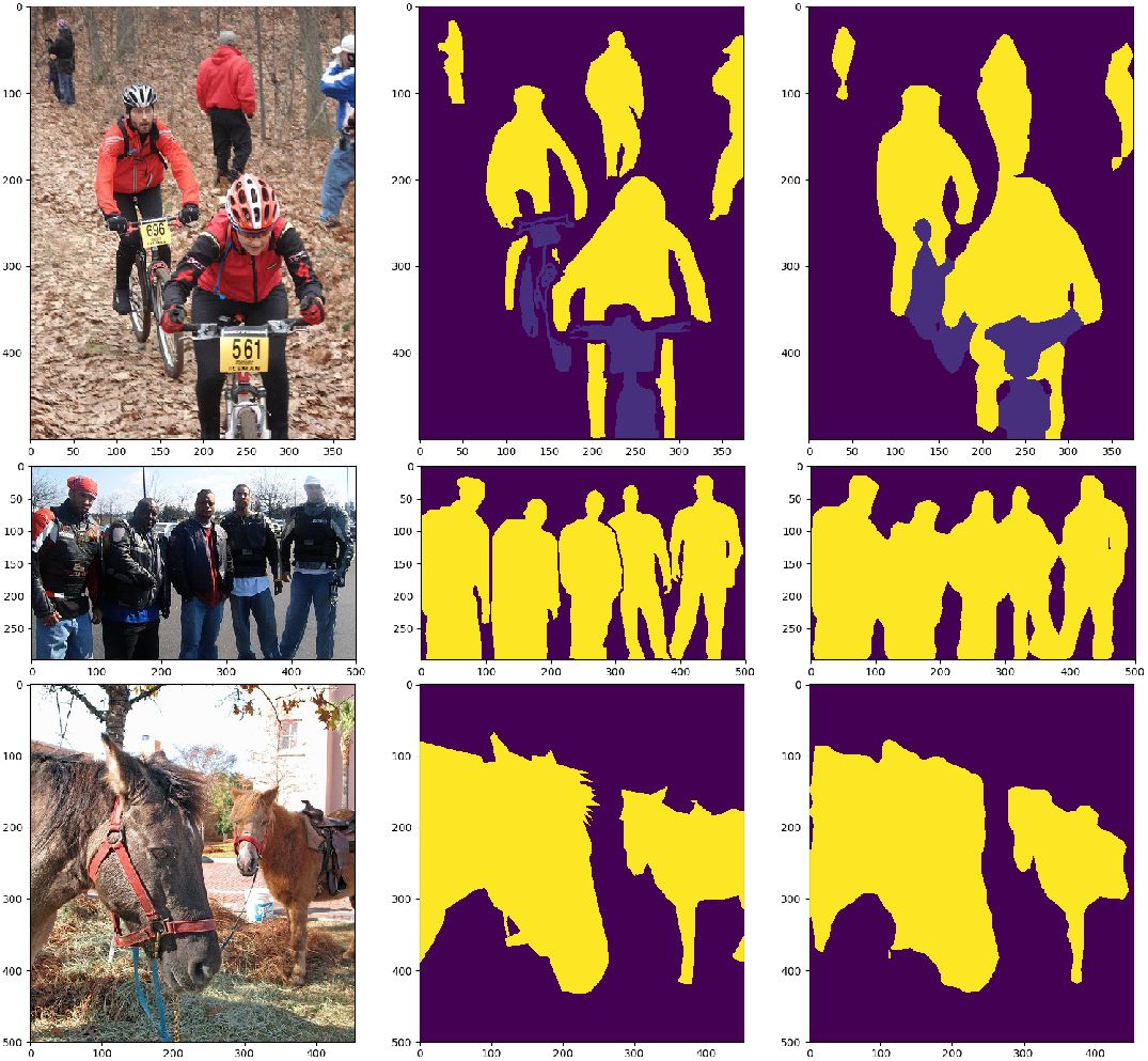 训练 为了训练网络,我们决定使用来自于《Semantic contours from inverse detectors》的扩增版的 Pascal VOC 数据集。 训练数据由 8252 张图像组成。训练集有 5623 张,验证集有 2299 张。为了使用原始的 VOC2012 验证数据集来测试模型,我们从验证集中删去了 558 张图像。这 558 张图片也出现在官方的 VOC 验证集中。此外,我还添加了来自 VOC 2012 训练集中的 330 幅图像,它们既没出现在 5623 张训练集中,也没出现在 2299 张的验证集中。最后,8252 张图像中的 10%(大约 825 张图像)用来验证,其余的图像留着训练。 注意,这与原始论文是不一样的:这次实现没有在 COCO 数据集上预训练。此外,论文中描述到的一些训练和评估技术也没有用到。 结果 模型能够在 PASCAL VOC 验证集上得到良好的结果。 像素准确率:大约 91% 平均准确率:大约 82% 均交并比(mIoU):大约 74% 频权交并比(FWIoU):大约 86% 以下是 PASCAL VOC 验证集的图像分割的结果。