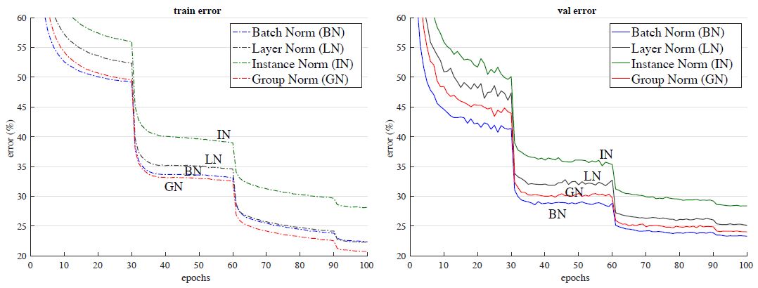 图 7:Kinetics 中,输入长度为 32 帧的误差曲线。FAIR 的研究人员展示了 ResNet-50 I3D 分别应用 BN(左侧)和 GN(右侧)的验证误差率,批量大小为 8 和 4 clips/GPU。实验监控的验证误差率是通过和训练集相同的数据增强得到的 1-clip 误差率。 论文:Group Normalization