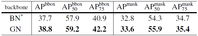 表 4:在 COCO 数据集上的目标检测和分割结果,使用 Mask R-CNN(ResNet-50 C4)。BN*表示 BN 被冻结。