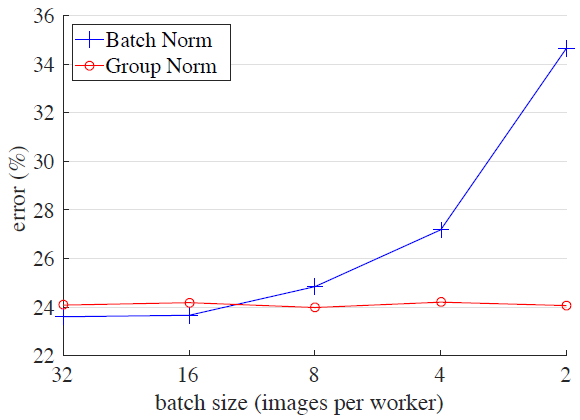 | 批归一化(Batch Norm/BN)是深度学习中非常有效的一个技术,极大地推进了计算机视觉以及之外领域的前沿。BN 通过计算一个(迷你)批量中的均值与方差来进行特征归一化。众多实践证明,它利于优化且使得深度网络易于收敛。批统计的随机不确定性也作为一个有利于泛化的正则化项。BN 已经成为了许多顶级计算机视觉算法的基础。 尽管取得了很大的成果,BN 也会因为归一不同批尺寸的独特行为而有缺点。特别是,BN 需要用到足够大的批大小(例如,每个工作站采用 32 的批量大小)。一个小批量会导致估算批统计不准确,减小 BN 的批大小会极大地增加模型错误率(图 1)。结果导致,如今许多模型都使用较大的批训练,它们非常耗费内存。反过来,训练模型时对 BN 效力的极度依赖性阻碍了人们用有限内存探索更高容量的模型。