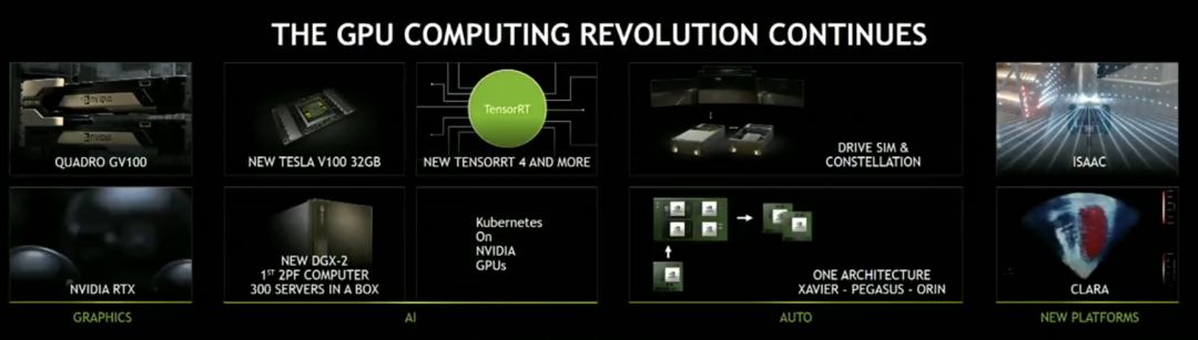 | 正如黄仁勋所说的,今天的发布会有关于:「Amazing science, amazing graphics, amazing products and amazing AI.」 核心内容: 新一代服务器级 GPU:搭载英伟达 RTX 技术的 GPU Quadro GV100,以及「世界最大的 GPU」 NVIDIA AI 平台:TensorRT 4 等技术,多种重大改进 推出 DRIVE Constellation 自动驾驶仿真系统