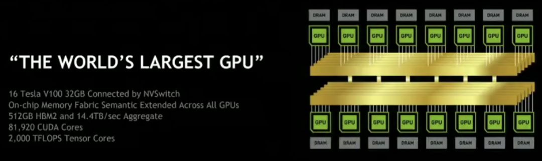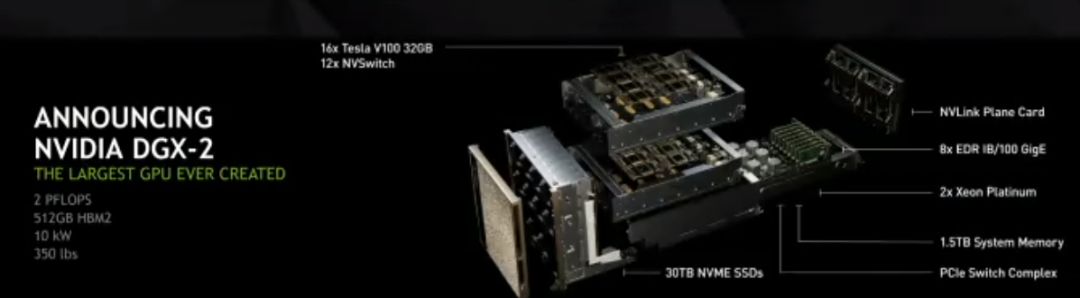 DGX-2 是首款能够提供每秒两千万亿次浮点运算能力的单点服务器,具有 300 台服务器的深度学习处理能力,占用 15 个数据中心机架空间,而体积则缩小 60 倍,能效提升 18 倍。