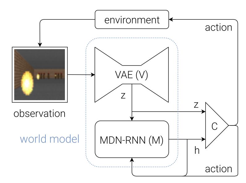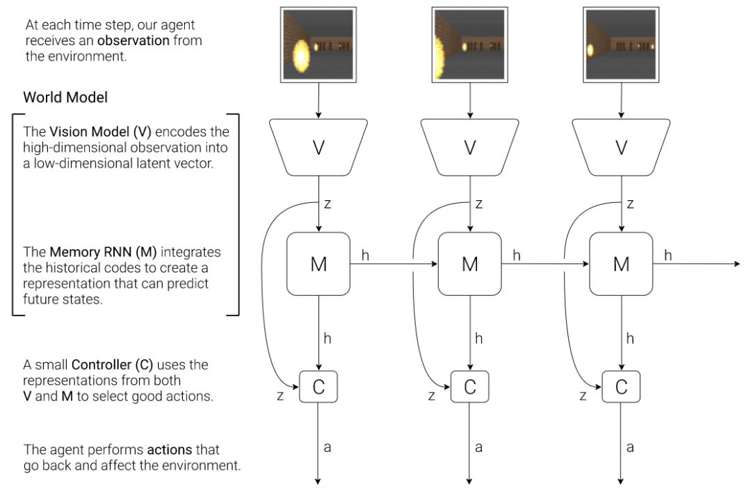 2.3. 控制器 (C) 模型 在环境的展开过程中,控制器 (C) 负责决定动作进程以最大化智能体期望的累加奖励。在我们的试验中,我们尽可能使 C 模型简单而小,并把 V 和 M 分开训练,从而智能体的绝大多数复杂度位于世界模型(V 和 M)之中。 2.4. 合并 V、M 和 C 下面的流程图展示了 V、M 和 C 如何与环境进行交互: 图 8:智能体模型的流程图。原始的观察每个时间步 t 到 zt 首先在 V 上进行处理。C 的输入是隐向量 zt 在每个时间步上与 M 隐藏态的串接。随后 C 会输出动作矢量以控制 motor,这会影响整个环境。随后 M 会以 zt 作为输入,生成时间 t+1 的状态 ht+1。