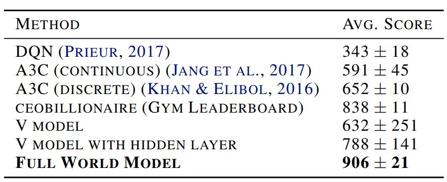 表 1:多种方法实现的 CarRacing-v0 分数。 因为我们的世界模型能够对未来建模,因此我们能自行假设或预想赛车场景。给定当前状态,我们可以要求模型产生 z_{t+1} 的概率分布,然后从 z_{t+1} 中采样并作为真实世界的观察值。我们可以将已训练的 C 放回由 M 生成的预想环境中。下图展示了模型所生成的预想环境,而该论文的在线版本展示了世界模型在预想环境中的运行。