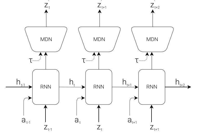 图 5:VAE 的流程图。 在我们的试验中,我们使用一个变分自编码器 (VAE) (Kingma & Welling, 2013; Jimenez Rezende et al., 2014) 作为 V 模型。 2.2. MDN-RNN (M) 模型 尽管在每一时间帧上压缩智能体的所见是 V 模型的任务,我们也想压缩随着时间发生的一切变化。为达成这一目的,我们让 M 模型预测未来,它可以充当 V 预期产生的未来 z 向量的预测模型。由于自然中的很多复杂环境是随机的,我们训练 RNN 以输出一个概率密度函数 p(z) 而不是一个确定性预测 z。