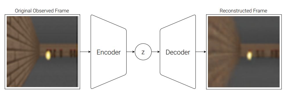 图 4:我们的智能体包含紧密相连的三个模块: 视觉 (V)、记忆 (M) 和控制器 (C)。 2.1. VAE (V) 模型 环境在每一时间步上为我们的智能体提供一个高维输入观测,这一输入通常是视频序列中的一个 2D 图像帧。VAE 模型的任务是学习每个已观测输入帧的抽象压缩表征。