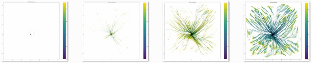 图 4 LSTM 最后一层的激活 令人惊讶的是所有路径看起来都非常平滑并且在空间上能很好地分离,因为实际上在训练自编码器前,每个时间步和样本的所有激活操作都被打乱了。图 4 中的空间结构解释了为什么我们的最后一个分类层在如此小的训练集上(接近 2000 个样本)能达到很高的准确率。 对于那些有兴趣研究这个 2D 空间的读者而言,我们已经在以下地址提供了图 2 的大型版本:https://image.ibb.co/fK867c/lstm2d_BIG.png。 在图 5 中,我们展示了三维 LSTM 激活的可视化结果。为了清晰起见,我们只标明了一部分点。出于数据分析的目的,我们在本文第二部分只关注 2D 可视化。