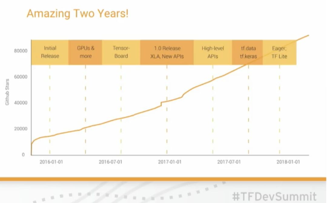 | 在大会上午的 Keynote 中,谷歌大脑负责人 Jeff Dean、TensorFlow 总监 Rajat Monga 等人围绕 TensorFlow 做了表现、流行度等方面的介绍。 据介绍,在过去的两年中,TensorFlow 不断更新,不断改善,逐渐成为社区内最为流行的深度学习框架。下图是从开源以来,TensorFlow 的重大更新,例如 TensorBoard、tfdata、tfkeras、Eager Execution 等。