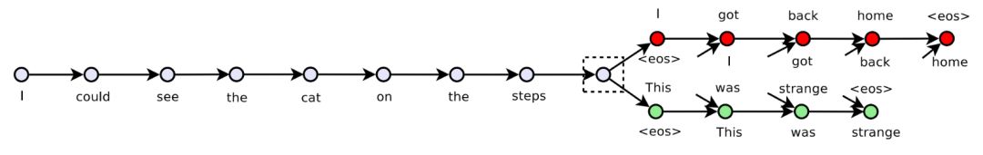skip-thought 论文中的例子(https://arxiv.org/abs/1506.06726) 我们将构造一个类似于自编码器的序列到序列结构,但是它与自编码器有两个主要的区别。第一,我们有两个 LSTM 输出层:一个用于之前的句子,一个用于下一个句子;第二,我们会在输出 LSTM 中使用教师强迫(teacher forcing)。这意味着我们不仅仅给输出 LSTM 提供了之前的隐藏状态,还提供了实际的前一个单词(可在上图和输出最后一行中查看输入)。 #Build x and y num_words=2000 maxlen=20 tokenizer = Tokenizer(num_words = num_words, split=' ') tokenizer.fit_on_texts(sentenses) seqs = tokenizer.texts_to_sequences(sentenses) pad_seqs = pad_sequences(seqs,maxlen) x_skip = [] y_before = [] y_after = [] for i in tqdm(range(1,len(seqs)-1)): if len(seqs[i])>4: x_skip.append(pad_seqs[i].tolist()) y_before.append(pad_seqs[i-1].tolist()) y_after.append(pad_seqs[i+1].tolist()) x_before = np.matrix([[0]+i[:-1] for i in y_before]) x_after =np.matrix([[0]+i[:-1] for i in y_after]) x_skip = np.matrix(x_skip) y_before = np.matrix(y_before) y_after = np.matrix(y_after) #Building the model embed_dim = 150 latent_dim = 128 batch_size = 64 #### Encoder Model #### encoder_inputs = Input(shape=(maxlen,), name='Encoder-Input') emb_layer = Embedding(num_words, embed_dim,input_length = maxlen, name='Body-Word-Embedding', mask_zero=False) x = emb_layer(encoder_inputs) _, state_h = GRU(latent_dim, return_state=True, name='Encoder-Last-GRU')(x) encoder_model = Model(inputs=encoder_inputs, outputs=state_h, name='Encoder-Model') seq2seq_encoder_out = encoder_model(encoder_inputs) #### Decoder Model #### decoder_inputs_before = Input(shape=(None,), name='Decoder-Input-before') # for teacher forcing dec_emb_before = emb_layer(decoder_inputs_before) decoder_gru_before = GRU(latent_dim, return_state=True, return_sequences=True, name='Decoder-GRU-before') decoder_gru_output_before, _ = decoder_gru_before(dec_emb_before, initial_state=seq2seq_encoder_out) decoder_dense_before = Dense(num_words, activation='softmax', name='Final-Output-Dense-before') decoder_outputs_before = decoder_dense_before(decoder_gru_output_before) decoder_inputs_after = Input(shape=(None,), name='Decoder-Input-after') # for teacher forcing dec_emb_after = emb_layer(decoder_inputs_after) decoder_gru_after = GRU(latent_dim, return_state=True, return_sequences=True, name='Decoder-GRU-after') decoder_gru_output_after, _ = decoder_gru_after(dec_emb_after, initial_state=seq2seq_encoder_out) decoder_dense_after = Dense(num_words, activation='softmax', name='Final-Output-Dense-after') decoder_outputs_after = decoder_dense_after(decoder_gru_output_after) #### Seq2Seq Model #### seq2seq_Model = Model([encoder_inputs, decoder_inputs_before,decoder_inputs_after], [decoder_outputs_before,decoder_outputs_after]) seq2seq_Model.compile(optimizer=optimizers.Nadam(lr=0.001), loss='sparse_categorical_crossentropy') seq2seq_Model.summary() history = seq2seq_Model.fit([x_skip,x_before, x_after], [np.expand_dims(y_before, -1),np.expand_dims(y_after, -1)], batch_size=batch_size, epochs=10, validation_split=0.12) #Feature extraction headlines = tokenizer.texts_to_sequences(data['headline'].values) headlines = pad_sequences(headlines,maxlen=maxlen)x = encoder_model.predict(headlines) #classifier X_train,y_train,X_test,y_test = x[msk],y[msk],x[~msk],y[~msk] lr = LogisticRegression().fit(X_train,y_train) lr.score(X_test,y_test)