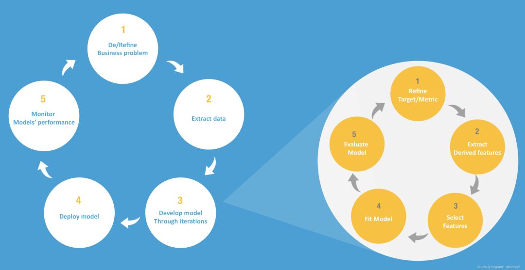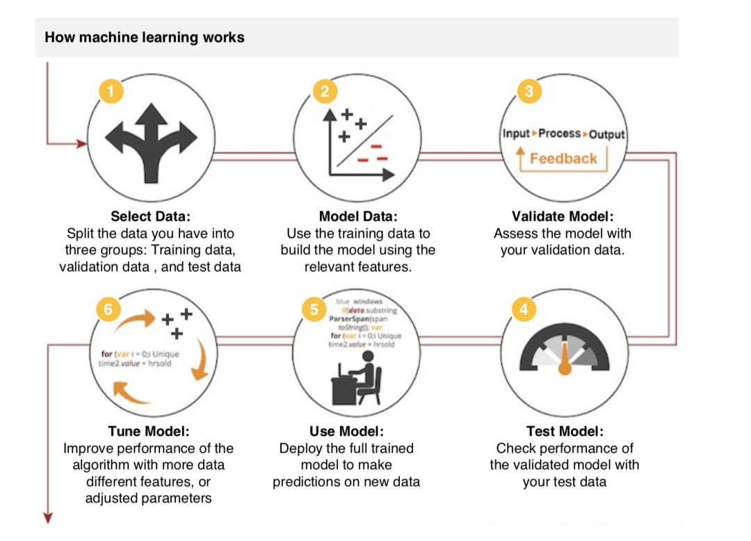 Part 1 介绍了基本概念,包括: 机器学习的流程 数据处理 建模 评估指标(如 MSE、ROC 曲线) 模型部署 过度拟合 正则化等 在第一部分,作者先介绍了如今应用普遍的机器学习:从自动驾驶、语音助手到机器人。其中有些思想,也是众多读者们了解过的,例如:为何机器学习在这个时候会火(大数据、计算力、更好的算法);机器学习、人工智能、深度学习三者的关系等。 除了这些基础概念,这份教程也对机器学习模型的开发流程做了图像化展示(如下图),即使对此不太了解的读者,也能通过这种流程展示有所学习。