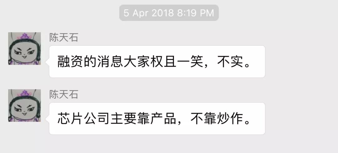 | 4 月初,有传闻称寒武纪第二轮融资已经结束,国家队基金入场。较之 A 轮融资结束后的估值翻了一番。消息一出,立刻引发业内极大关注。不久,陈天石在朋友圈表示消息不属实,并强调寒武纪不靠炒作。 陈天石在朋友圈对消息做出回应